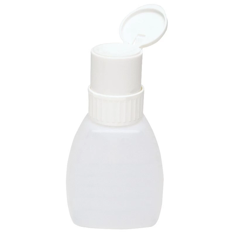 Deze doseerfles / pompflesje (type Menda) is te vullen met een vloeistof naar keuze (alcohol, aceton etc.) Druk met een depper, wipe, pad of wattenschijf op de pomp, waardoor de vloeistof naar boven wordt gepompt en en de depper wordt bevochtigd.